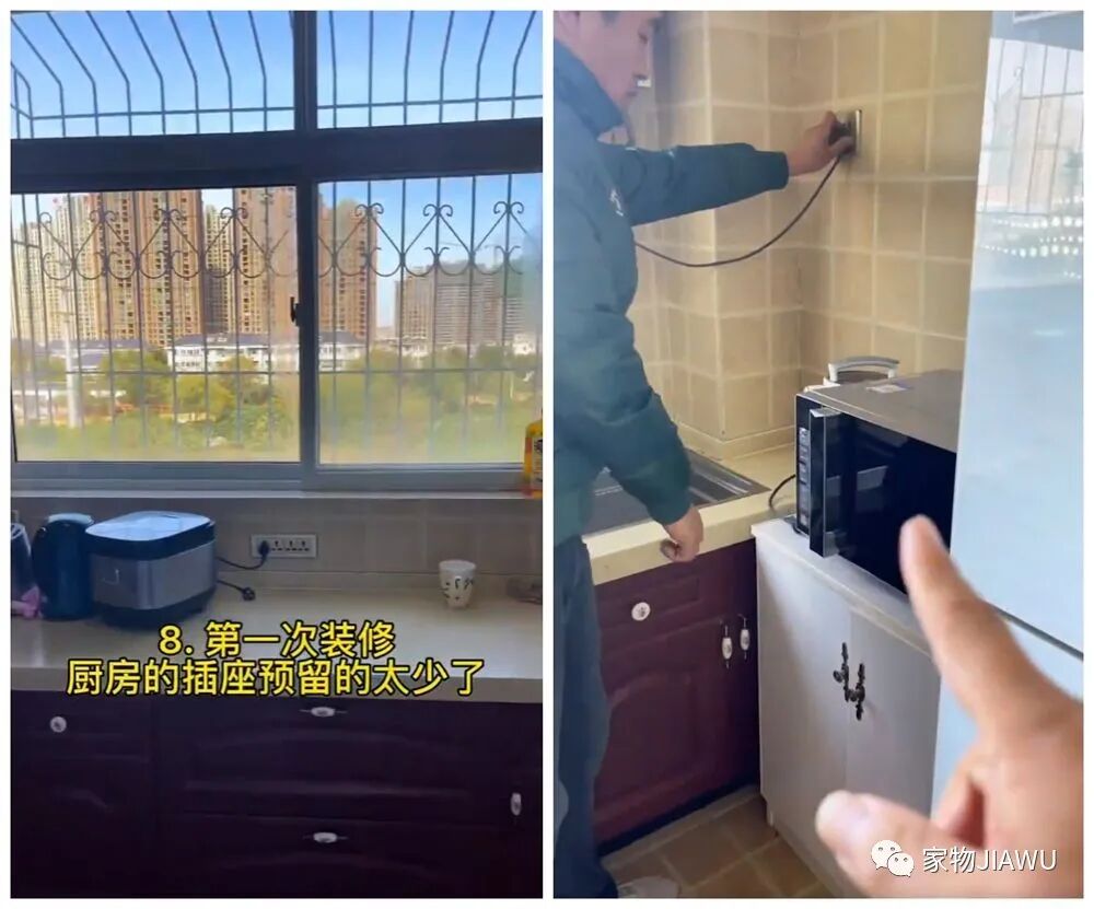 其次,就是厨房插座预留的问题,一个是插座预留太少,小厨电插座不够用;另一个就是预留的高度、位置有问题,用起来太麻烦。
