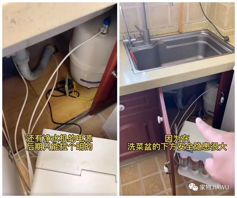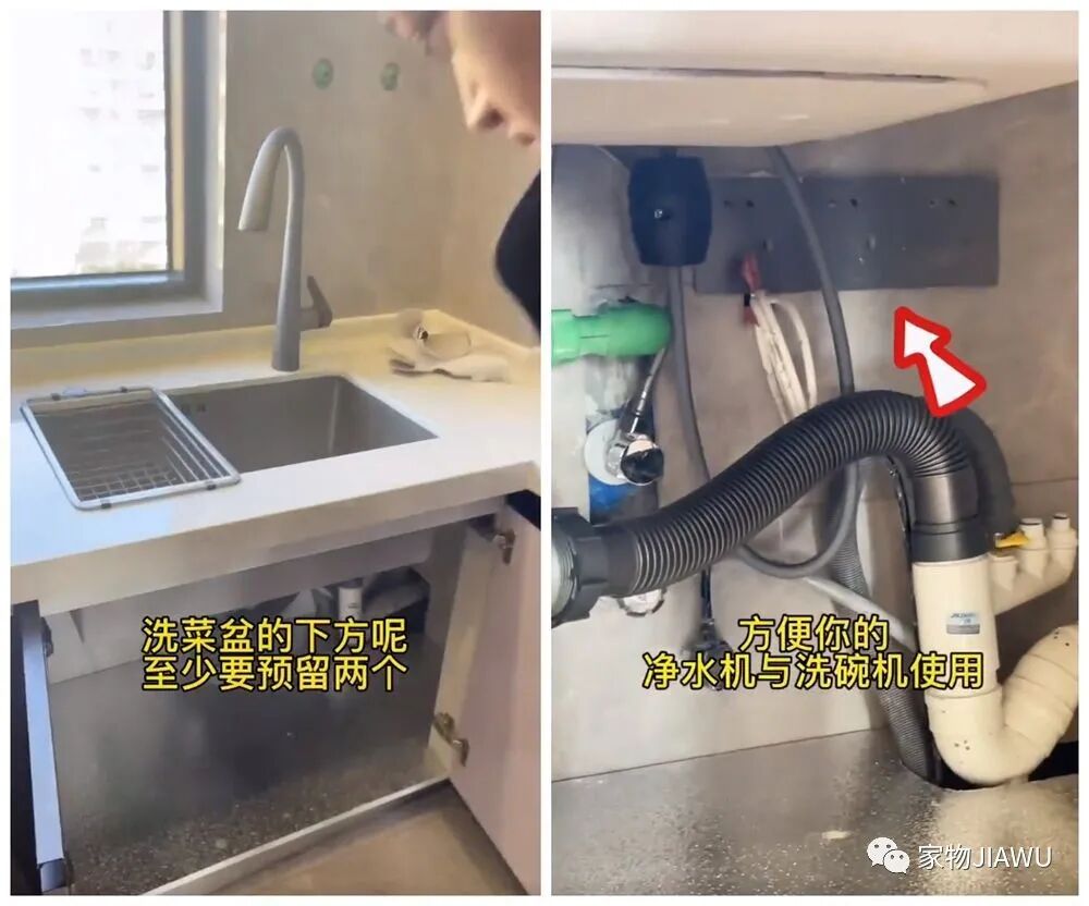 哦对,还有一个大家经常会忽略的地方,就是水槽下方需要预留的电源,净水器、洗碗机、厨余垃圾处理器基本上都会安装在这里,如果没有预留电源插座的话,就只能明接了,但这样的安全隐患无疑很大。