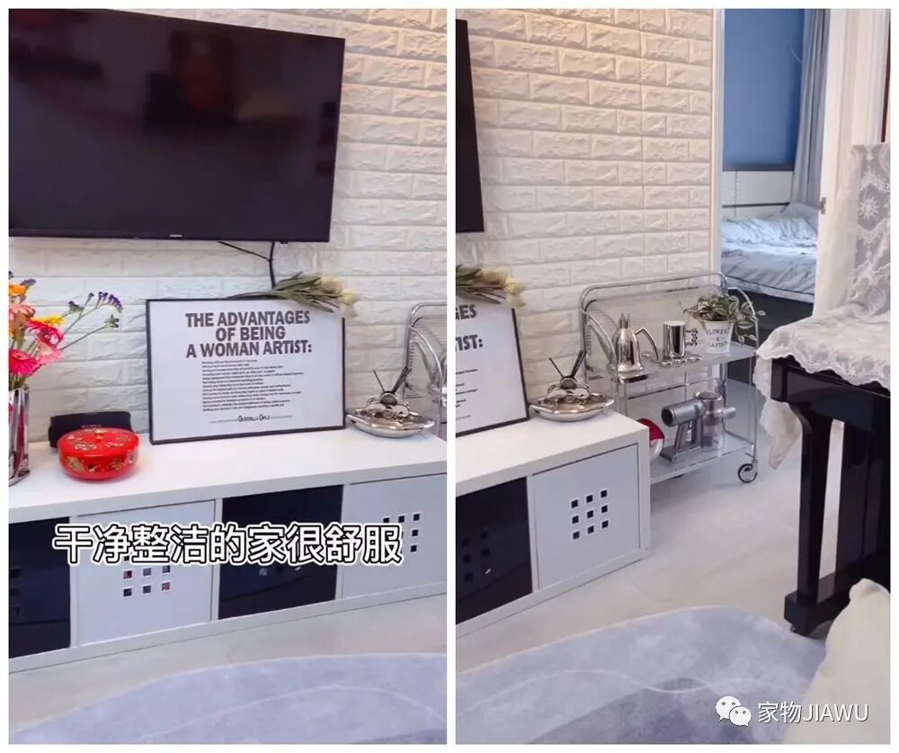 电视墙的区域也是一切从简,干净整洁的几面,让小户型也显得精致又高级,此外,下面的四个收纳格,也是家里日常收纳杂物的“主力区域”。