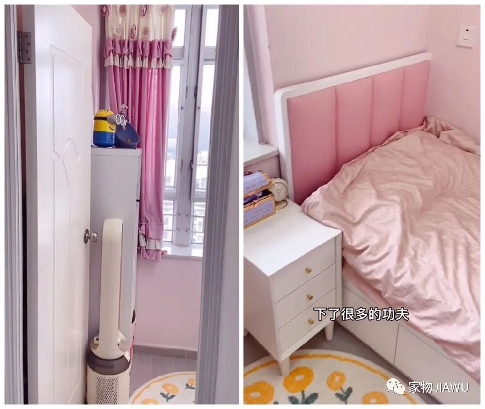 事实上,这个家里的两间卧室也正是如此,客厅直走进去就是女儿的卧室,狭窄的空间实在是不太好利用,只能用衣柜书桌一体式的单人床进行设计,充分利用空间。