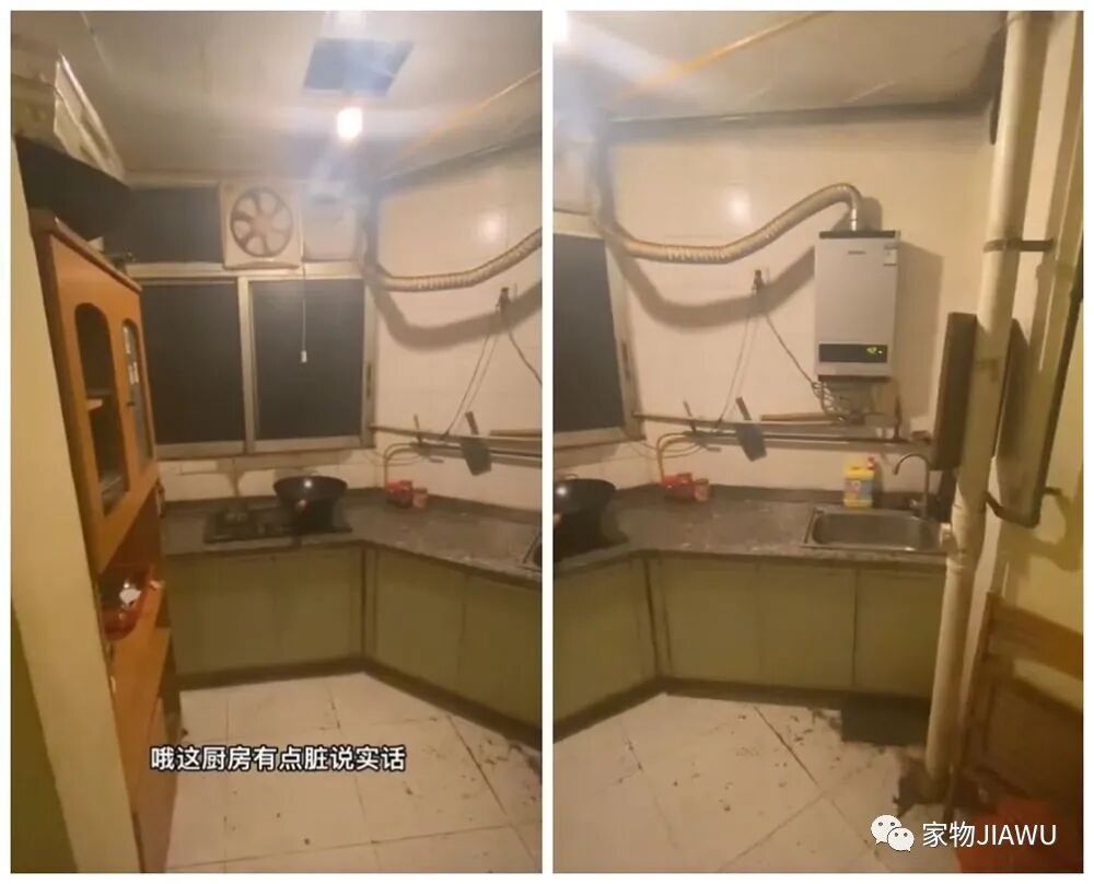 打开餐厨房的灯以后,发现果不其然,厨房是一种五边形的形状,而且由于很长时间没有租出去,所以里面的卫生条件堪忧,好在基本厨电和热水器一应俱全。