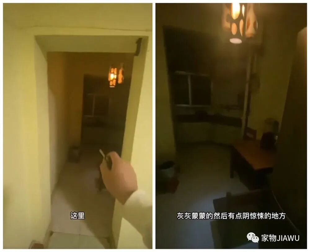 再往前走,是家里的厨房和餐厅,老旧的灯具同样散发着昏暗的灯光,而且依稀可以看到,房间并不是方正的户型。