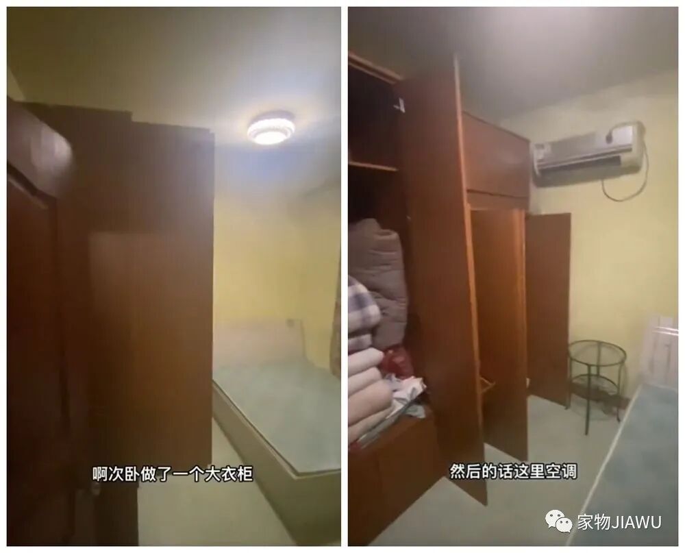 在次卧中,做了一套整体的大衣柜,柜门同样松散脱落,不过通顶的设计倒是提供了不少的收纳空间,大件的衣服、被褥都可以收入其中。