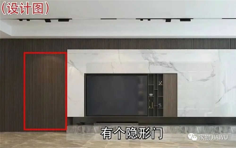 电视墙的位置,在原本的装修效果图中也非常大气,大理石的背景墙旁边,是竖条纹的隐形门,还是很漂亮的,当然,安装难度也要高一些。