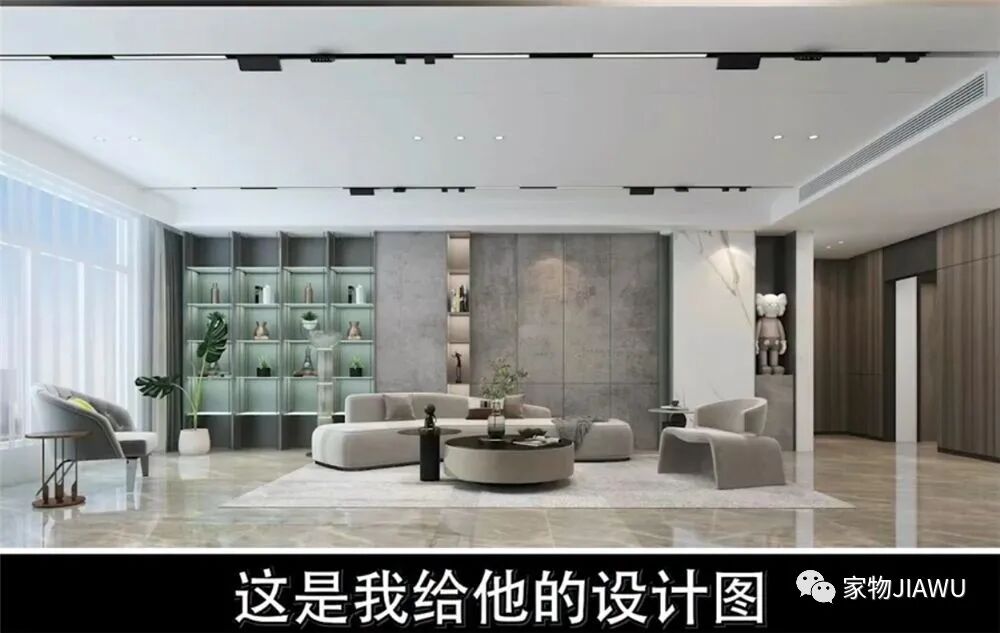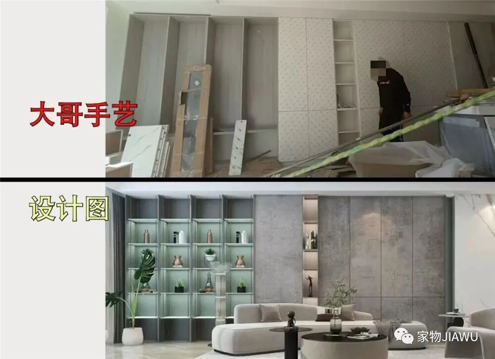 客厅整体柜装修出来的效果,就更是离谱了,据这位姑娘说,她当时和设计师商量的图纸,和给师傅看的图纸都是上面这个样子的,看起来是不是还挺高级的?