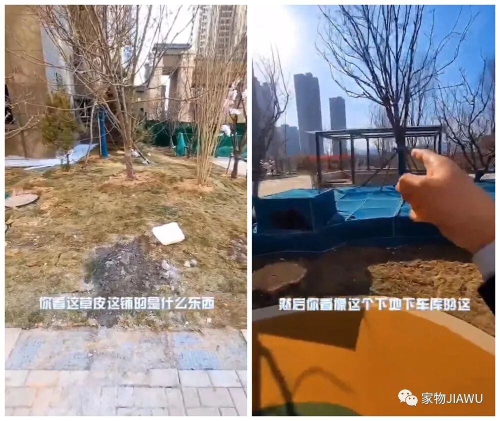 首先,刚进入小区内,就被这里的设施惊呆了,刚通知交房没多久,小区里的绿化已经是破败不堪,很多地方的草皮都已缺少,不知道的还以为这是个上年头的老小区呢。