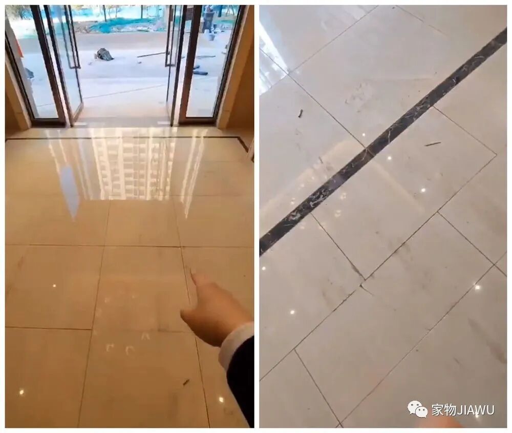 从大厅进入单元门廊,发现地上的瓷砖竟然不平整,有些地方还有缝隙、碎裂的情况,要知道这可是一个刚交房的新小区啊!确实有些离谱了。