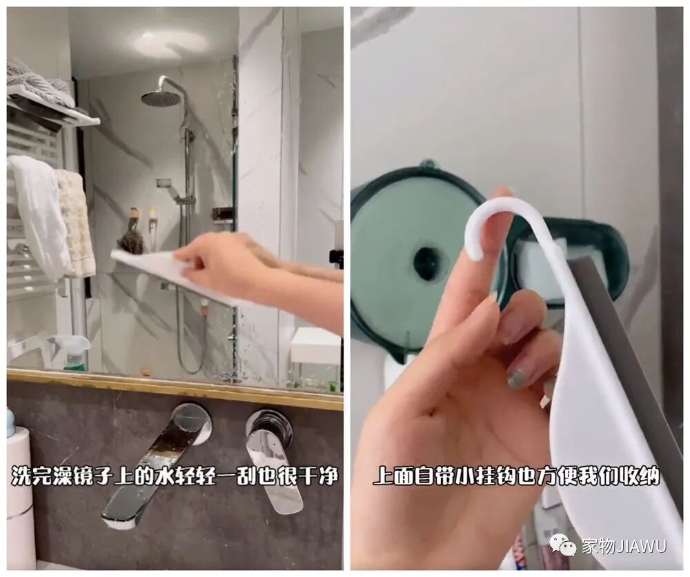 像是镜子上、瓷砖墙上的水渍,也可以用它刮干净,使用场景非常灵活,不用的时候呢,可以把它挂在卫生间内,收纳真的超方便!