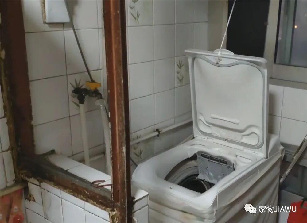 洗衣机也摆放在了厨房旁边的冗余空间,这里原本应该是类似后阳台一样的工作屋,现在则完全被当作堆放洗衣机和杂物的区域。