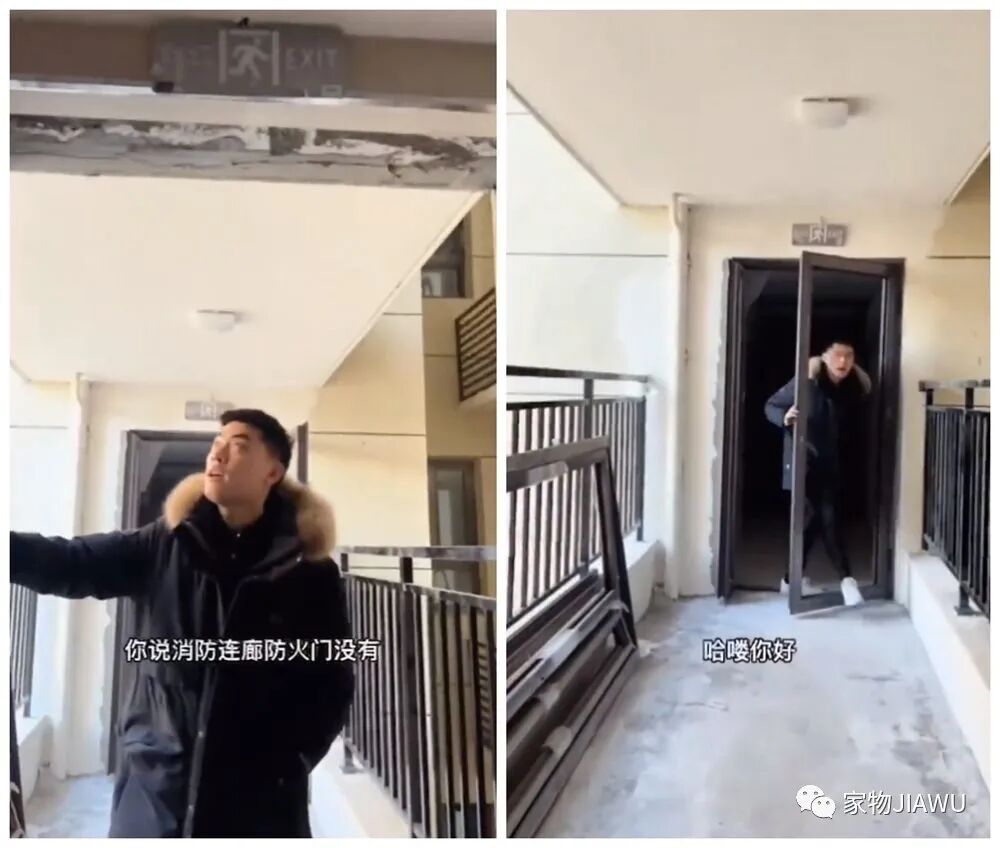 从电梯上楼以后,发现消防连廊的门居然没有装玻璃,另一边甚至干脆没有装门,地面也是坑坑洼洼的,真不知道这样怎么能过的检查。