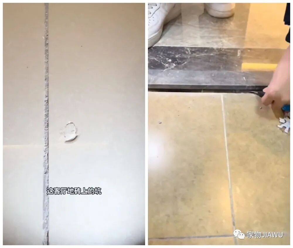 全屋地面的瓷砖也有不少问题,虽然没有大块的碎裂,但像是指甲盖大小的磕碰真的是不计其数,卫生间到客厅过门石下方,甚至能塞下钥匙去,不敢想象日后若是泡水,会有多少问题。