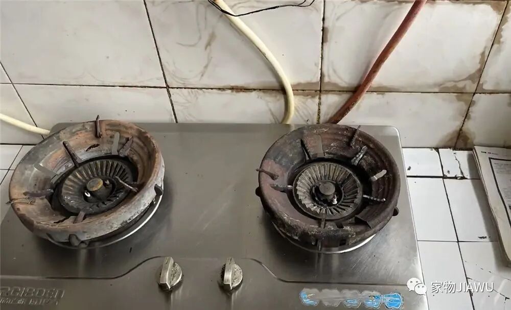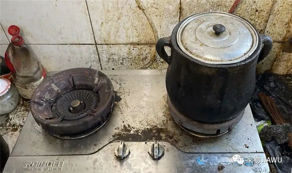 灶台区域在清理前,也同样有很厚重的油污顽渍,锅具和灶台火口上,以及周围的瓷砖墙上都是厚厚的油污,可想而知这位老奶奶有多久没清理过了。