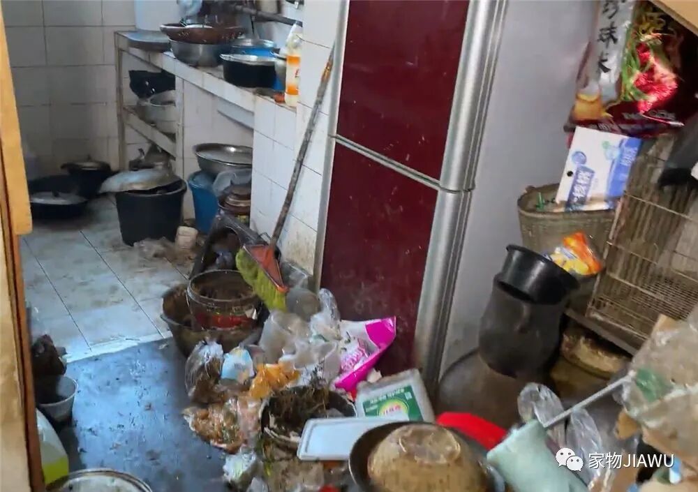 厨房内的各种垃圾也同样处于一个“离谱”的状态,从进入厨房内的冰箱附近开始,就能看到各种锅碗瓢盆和生活垃圾,油污甚至在地上糊了厚厚一层。