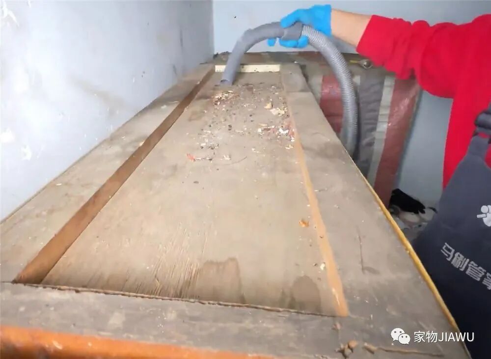 在清理柜顶的时候,意外发现了老鼠窝,所以几位保洁师也只能忍着无奈将柜顶尽可能清理干净,包括这些脏污垃圾、浮沉和老鼠粪便……