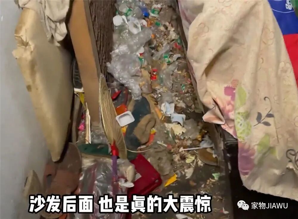 你以为这就是看到的全部垃圾?推开沙发后,后面的景象更是让人震惊!各种生活垃圾混合塑料袋,就这么扔在沙发后面,实在是让人没话说。