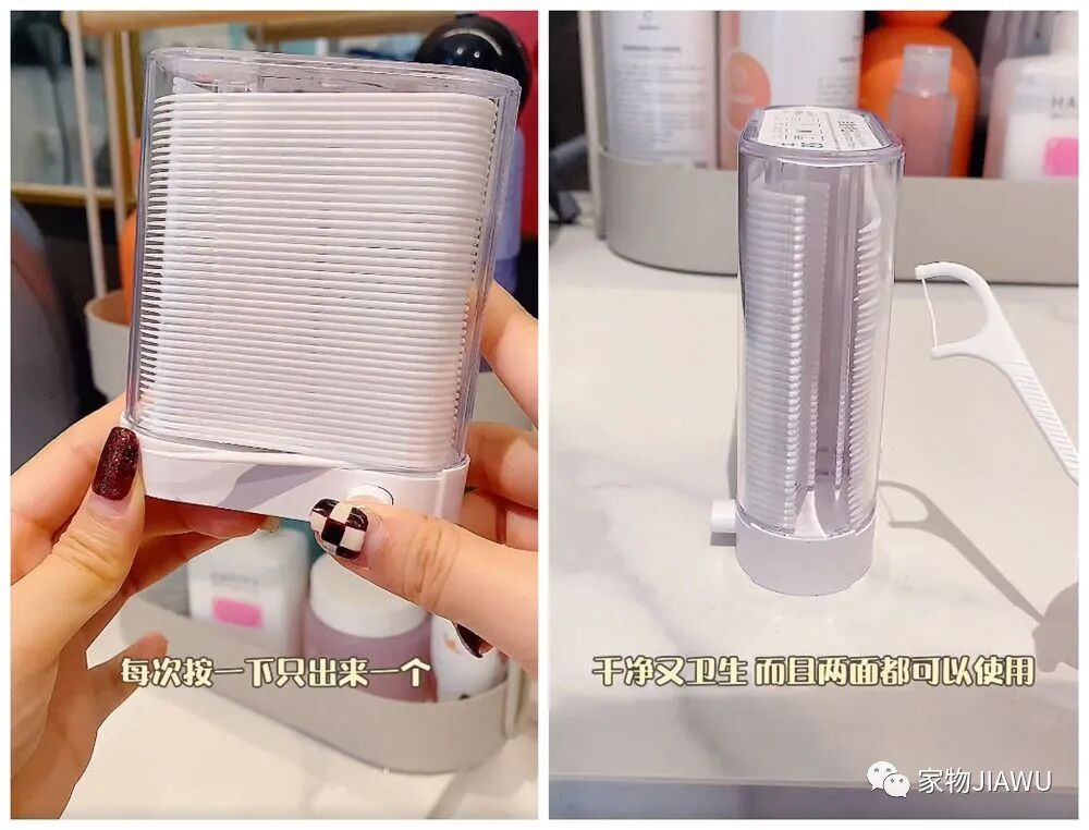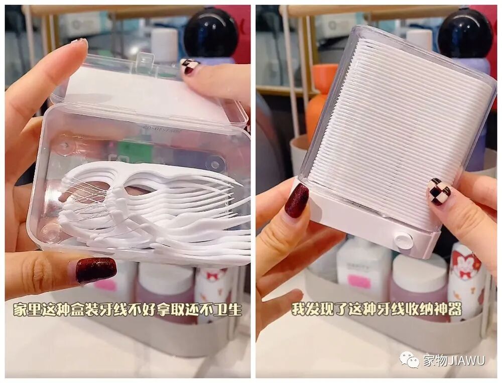 用牙线的朋友,大部分人都会用这种盒装的牙线,每次最大的问题就是拿取不便,同时还很不卫生,为了解决这一问题,可以尝试用这类的按压式收纳盒。
