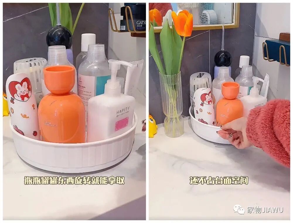 洗手台台面上瓶瓶罐罐东西太多,乱七八糟地不好看又不好拿怎么办?这种旋转式的收纳盘可解燃眉之急!