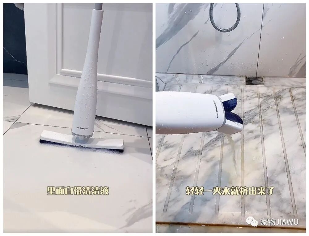 最关键的是,它有一个清洁液保存桶,使用时只需要简单按压,就能自动出清洁液,地面清洁更加干净一些。