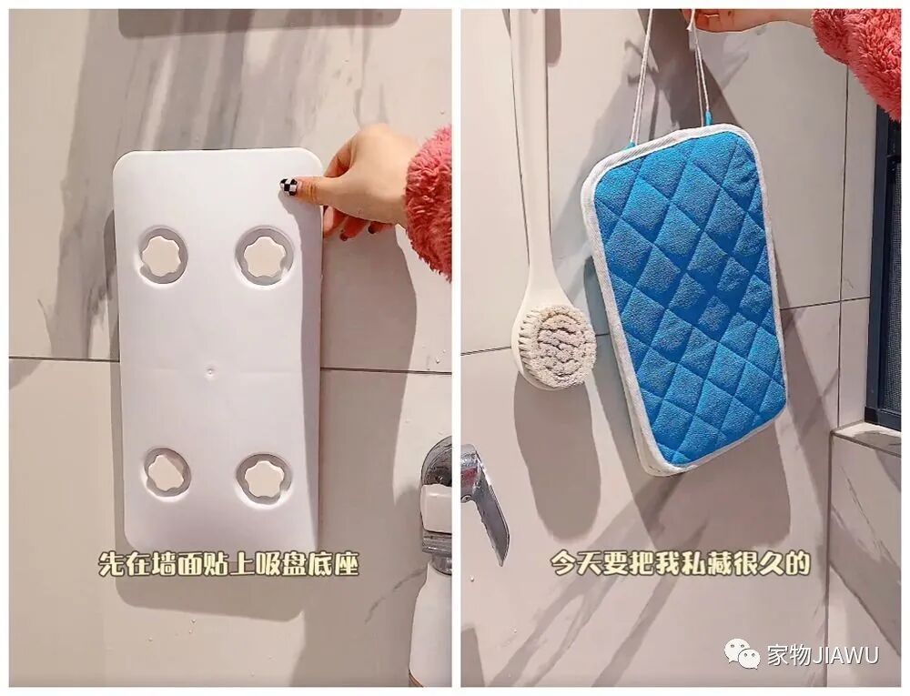 安装时,先把吸盘固定在墙面上,再套上搓背巾就OK。