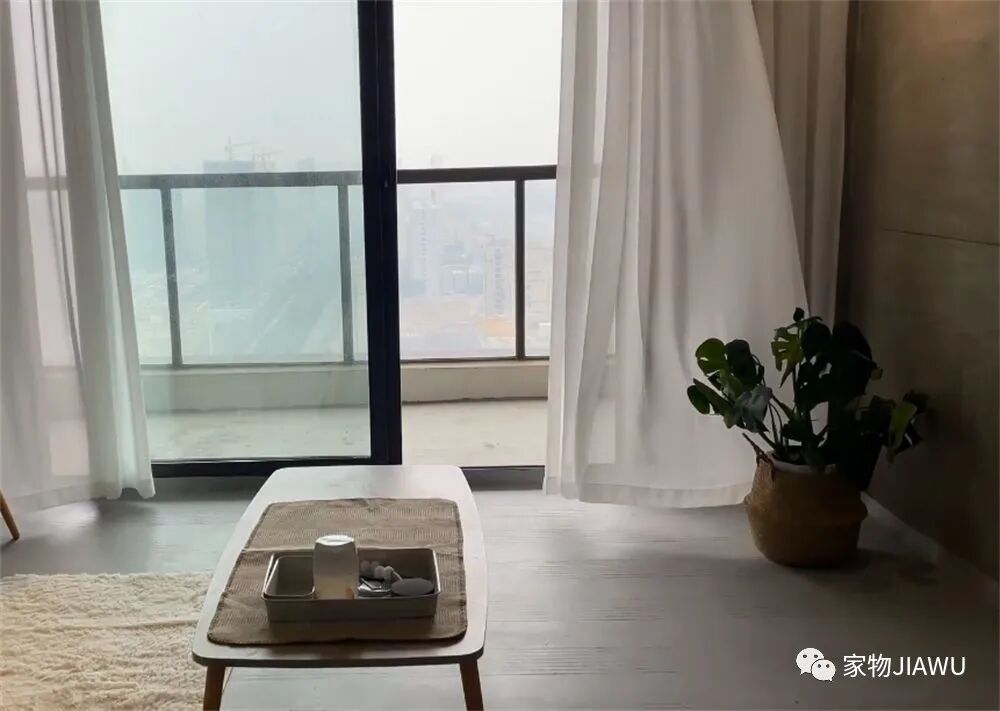 与客厅相连的阳台,目前并未封闭,自然也没有和客厅打通,只是在阳台门上安装了纱帘,来保证透光性和隐私性。