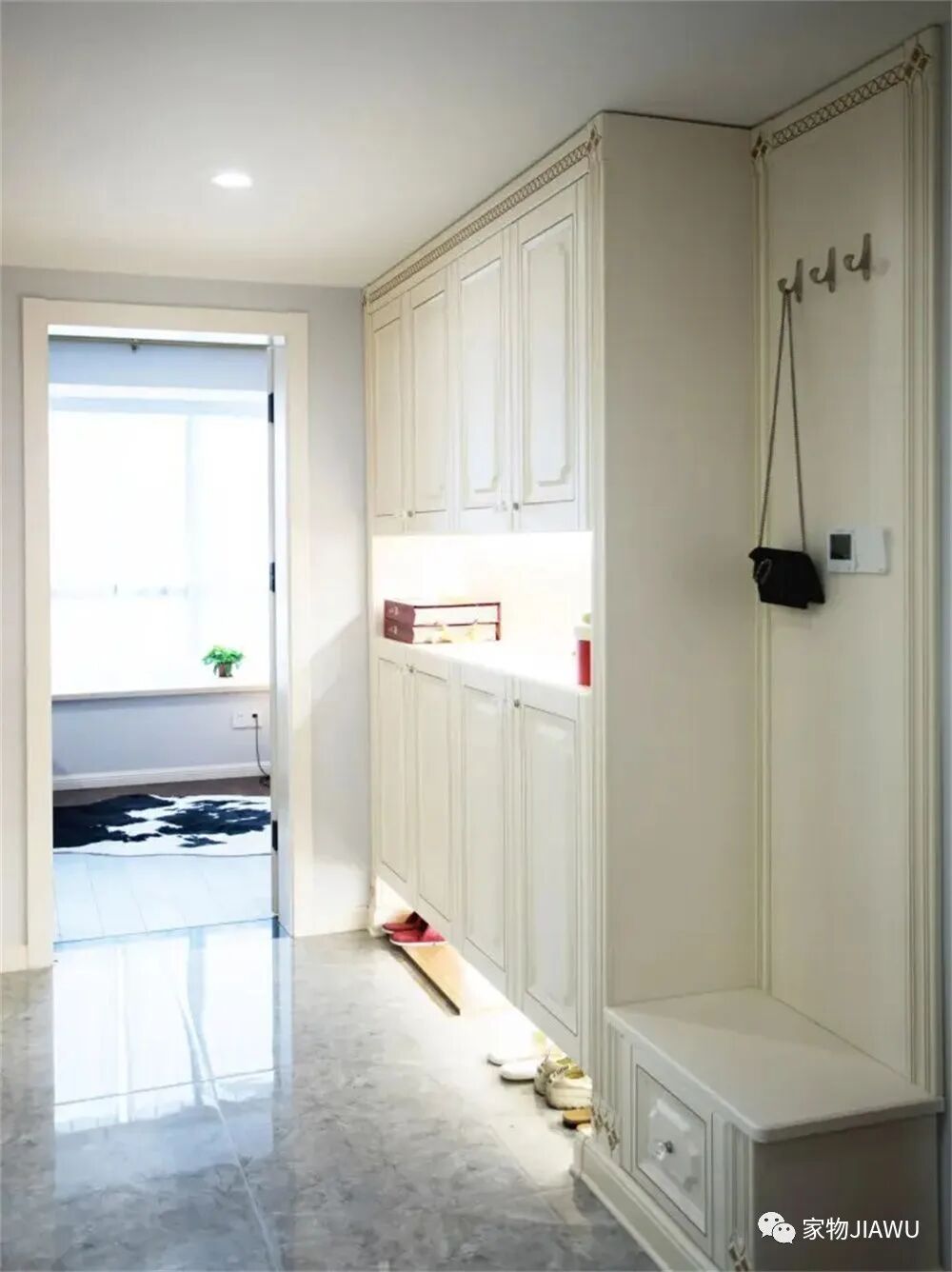 无论家里户型是大是小,只要格局允许,我都建议大家把鞋柜做到顶,一来能充分利用起纵向空间,起到收纳、置物的功能,二来也能让空间一体感更强一些。
