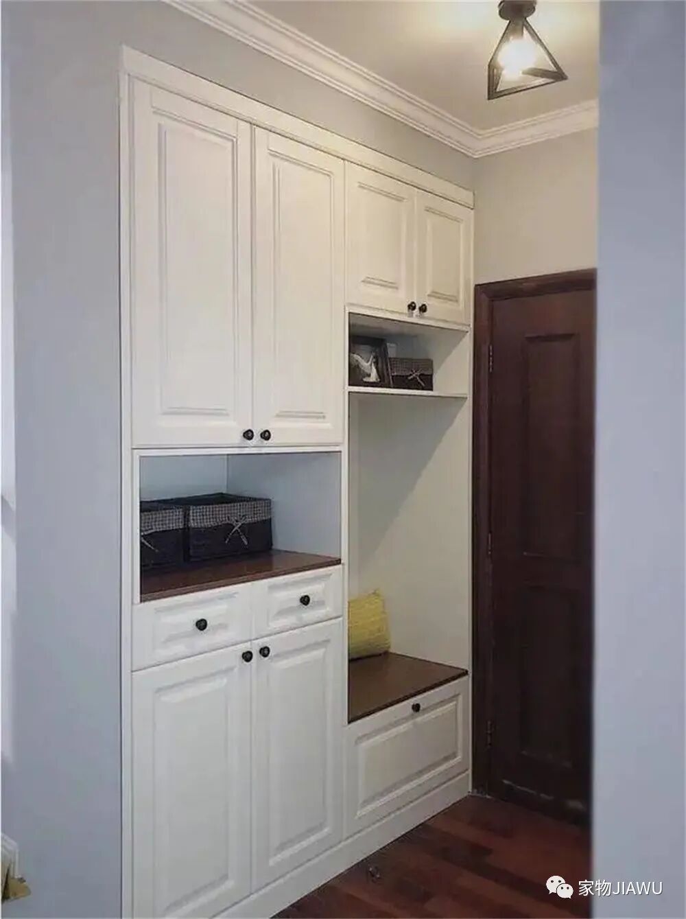 还是拿上面那条通定式玄关柜举例,玄关的柜子一定要设计置物区,即便是通顶的柜子,中间也要留出开放柜格,见过很多人家里直接做成封闭柜,到后来想放个东西都手足无措。