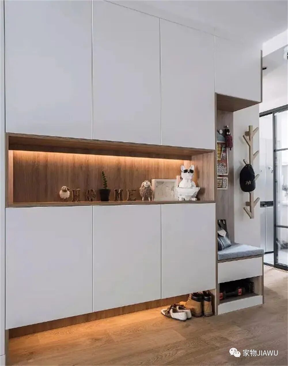 鞋柜下方我个人是建议留个感应灯带的,当然,这个可以根据个人需求来选择,不是必须非要留不可。