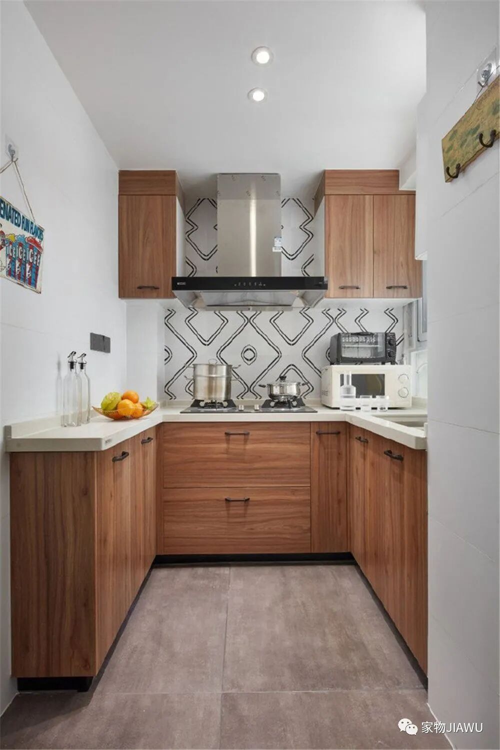 前面也说了,厨房位于一进门的左手边,虽然面积不大,但U形橱柜的设计,能带来更多的台面空间,夫妻二人在这里配合烹饪完全不成问题。
