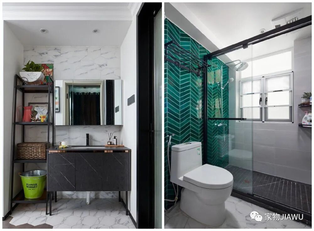 家里唯一的卫生间和浴室,也采用了“低配版”的三分离设计,洗手池被设计在了外面,而内部的马桶和浴室则用玻璃门进行简单隔断,还是蛮实用的。