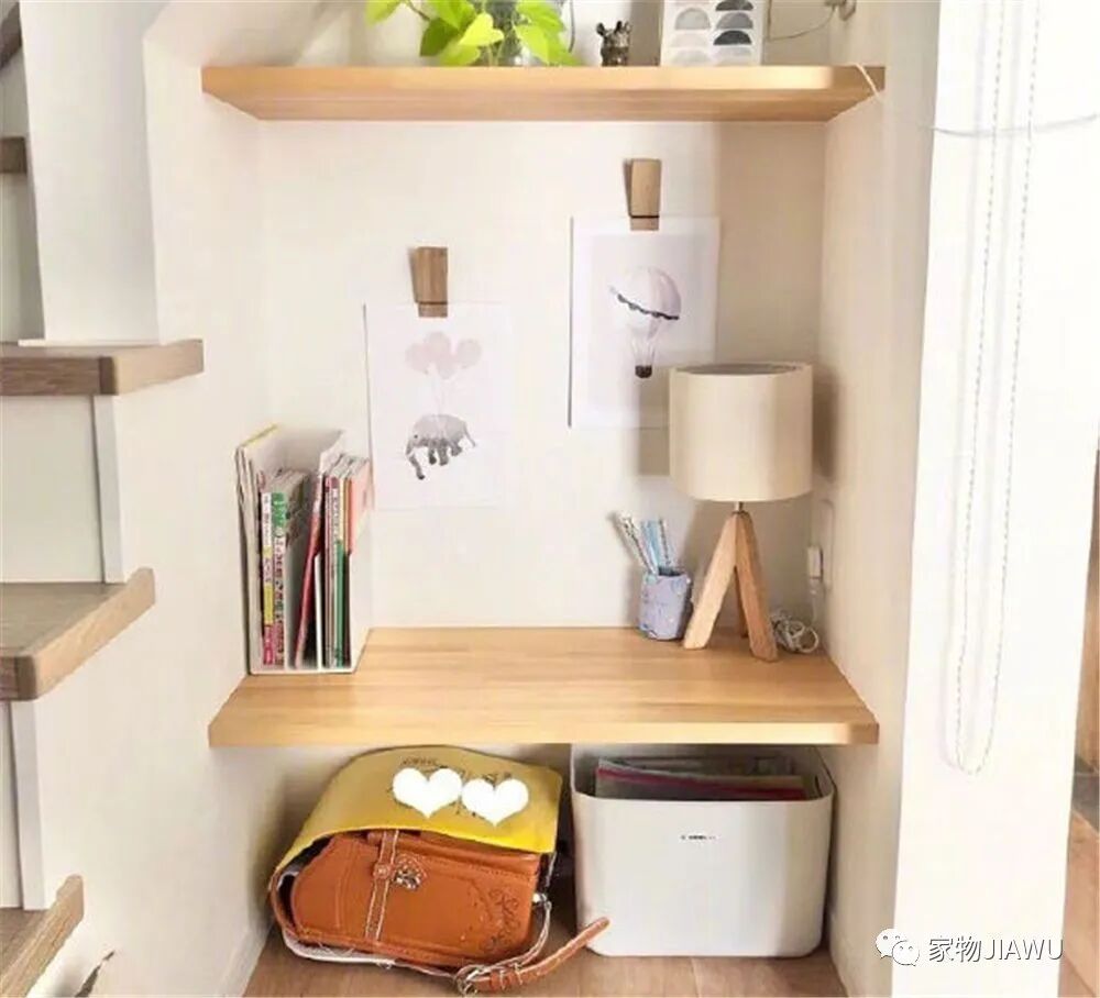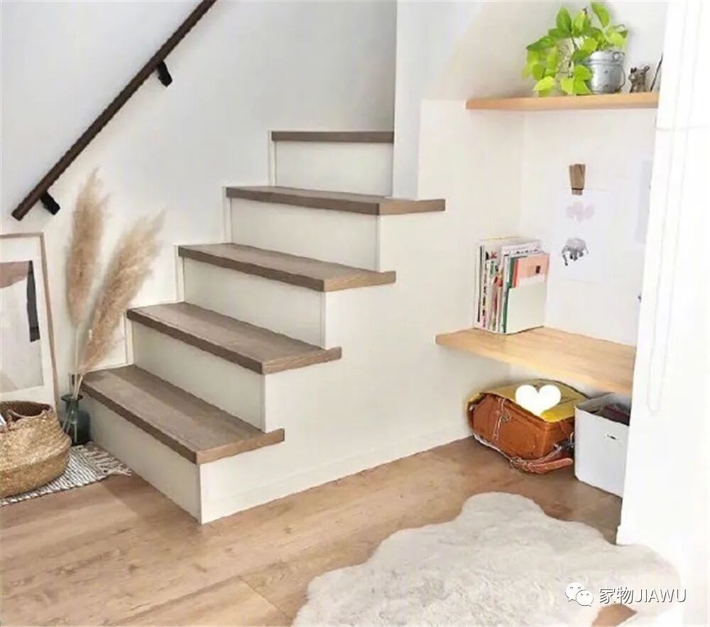 比如在楼梯间的角落中放上玩具箱、安装嵌入的桌板,就能当做一个孩子玩耍的娱乐区,平日里孩子在这个空间里写写画画,想想就觉得很温馨。