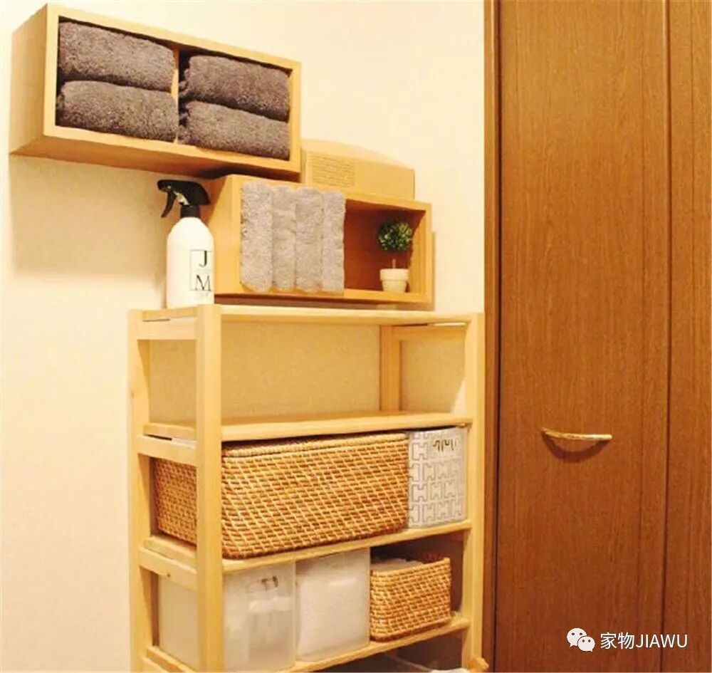 卫生间的空间要更小一些,有的户型中,门后区域可以用收纳架来提升纵向收纳空间,高度视收纳程度决定。