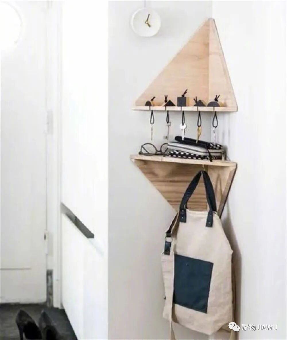 有些户型转角比较多,在玄关中我们同样可以用一些转角墙面架,为玄关提供更多的置物、收纳、挂放区。