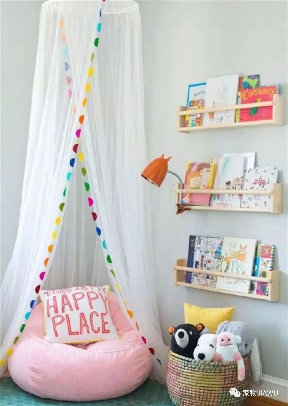 一个小小的阅读角,占用面积也同样能压缩到1㎡左右,哪怕你随便找一个家里的墙角,放上懒人沙发并安装墙面书架,就能打造出简单的阅读角了。