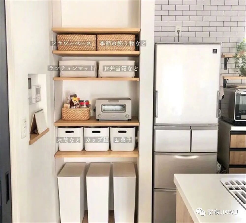 厨房中,可以利用一系列的墙龛、收纳柜,来利用纵向空间收纳锅碗瓢盆和瓶瓶罐罐,尺寸如果能完美贴合墙角,或填补橱柜冗余空间就最好不过了,往往占地面积不会大于1㎡。