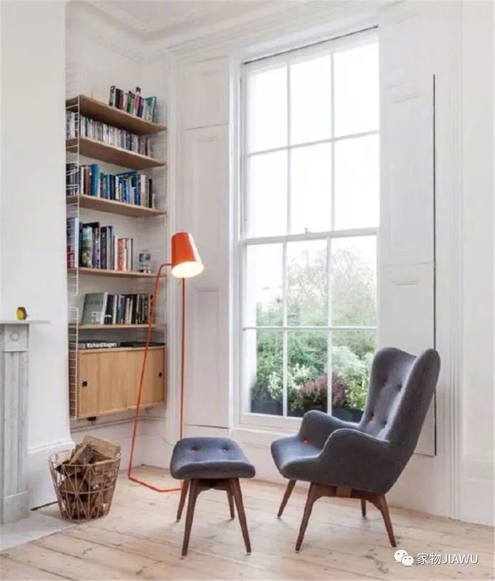 如果有一些难以利用的墙面夹缝、狭窄空间,同样可以利用书架和单人沙发来打造成阅读角,既巧妙利用起空间,又显得颇有格调。