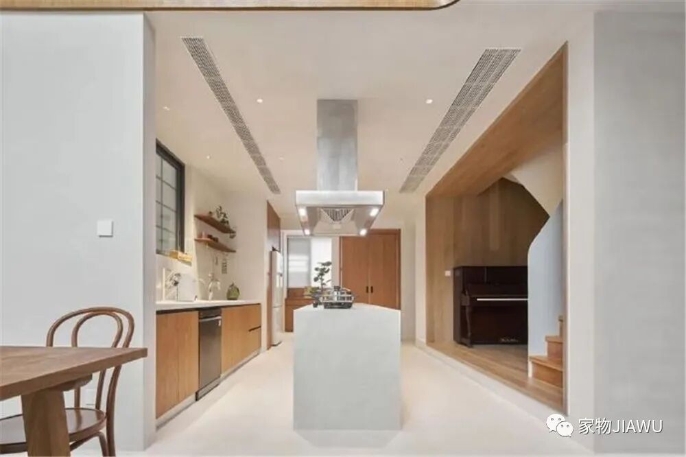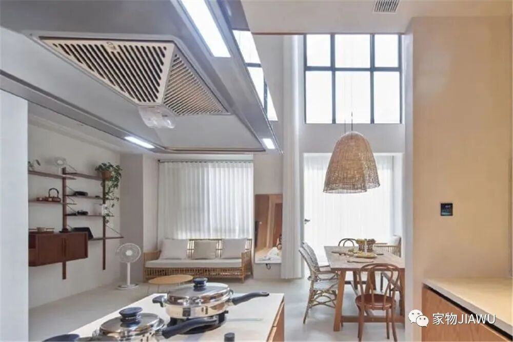 往里走去,家里的厨房也采用了开放式的格局设计,一组超大的烟灶尽可能抑制烹饪时的油烟逸散,帮开放式厨房减少油烟的困扰。
