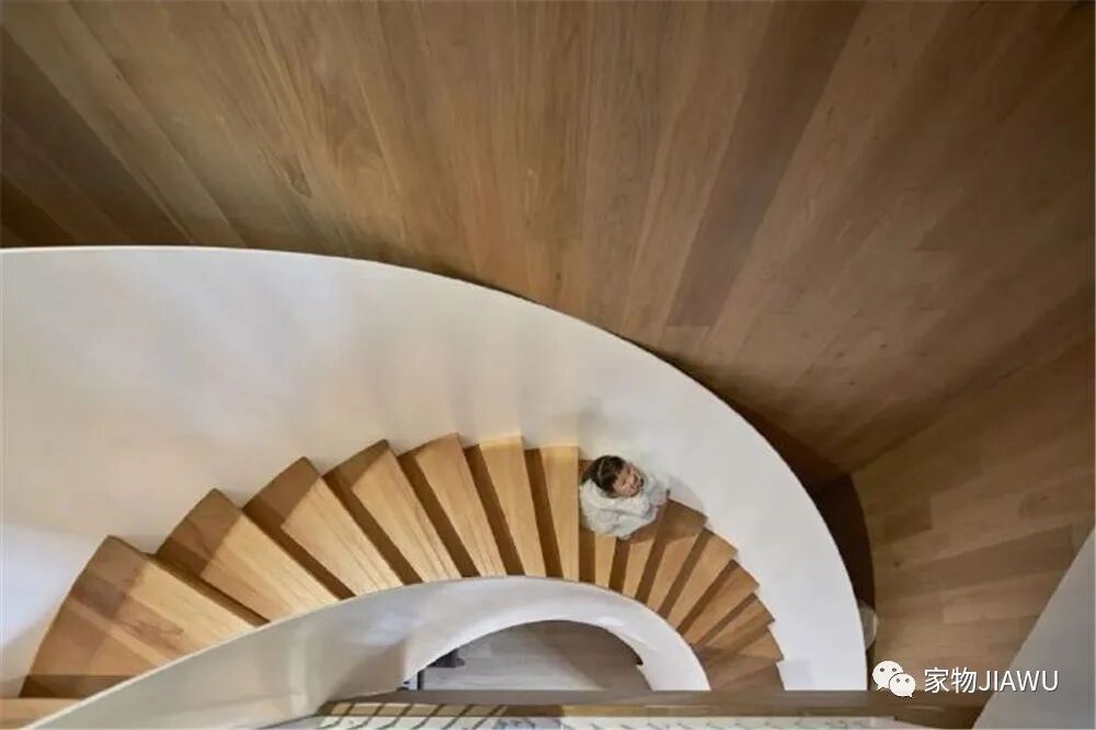 从二楼俯瞰楼梯台阶的形状,呈现出优美的弧线形,直接将艺术气息拉满。