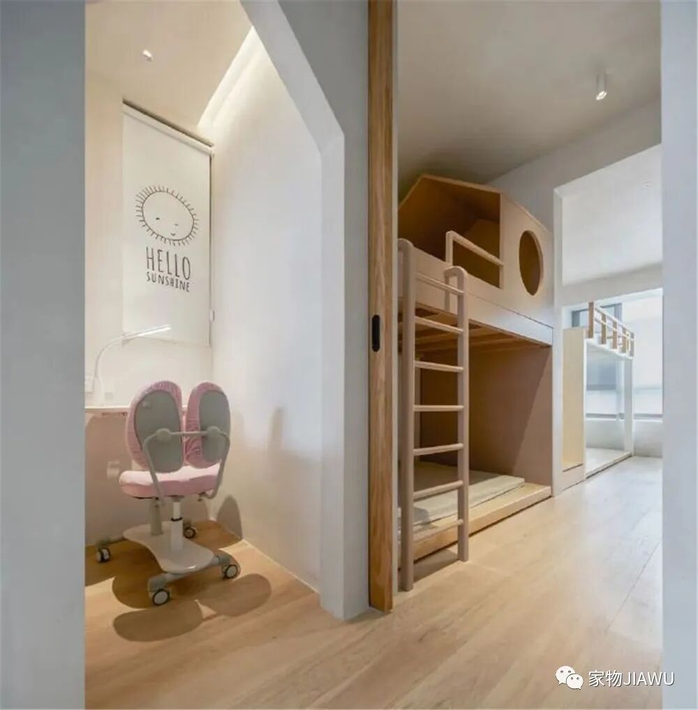 房间内一切,都是为了孩子们准备的,从攀爬向上的梯子,到可以钻进钻出的圆窗,都颇有童趣感。