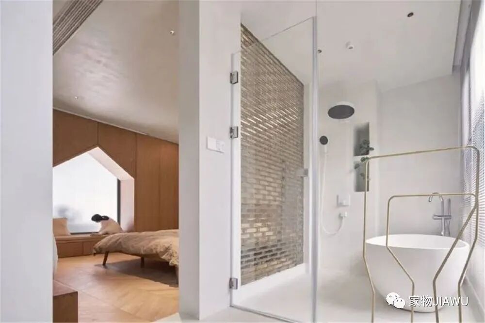 走进夫妻俩的主卧中,那种平淡、简约、柔和的感觉也进一步体现出来,在主卧床榻和浴室间,仅有一面半透明的玻璃砖墙进行分隔,让空间更加灵动的同时,也不会影响到室内的采光。