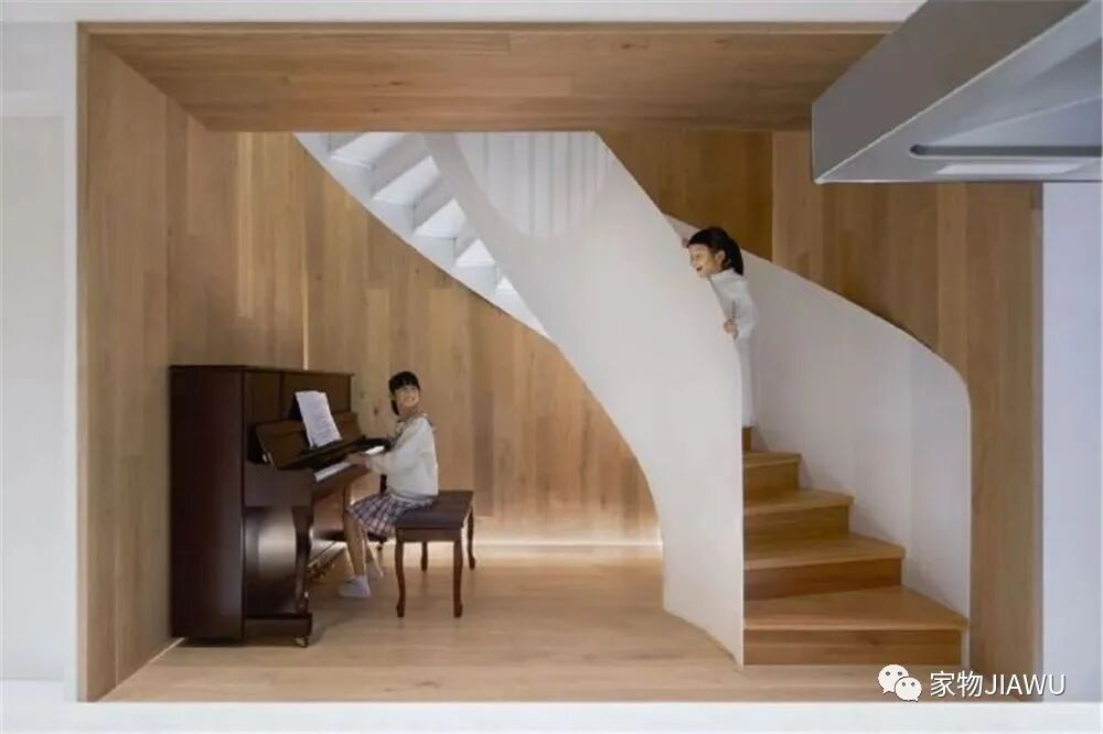 钢琴房是大女儿平日里练琴的地方,虽然是在“楼梯间”的位置,但不得不说这个楼梯间还真装修出了一种气派和高级的感觉,木色的“方盒子”搭配蜿蜒向上的楼梯,看上去美极了。