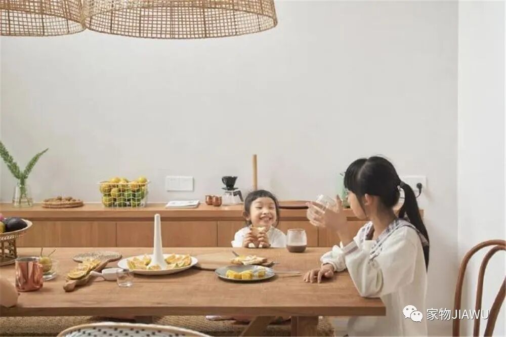 装修方面,就像我们一开始所说,采用这种原木色调为主体的设计,餐桌、餐边柜都有效中和了白墙带来的冰冷气息,给家增添了几分生机与活力。