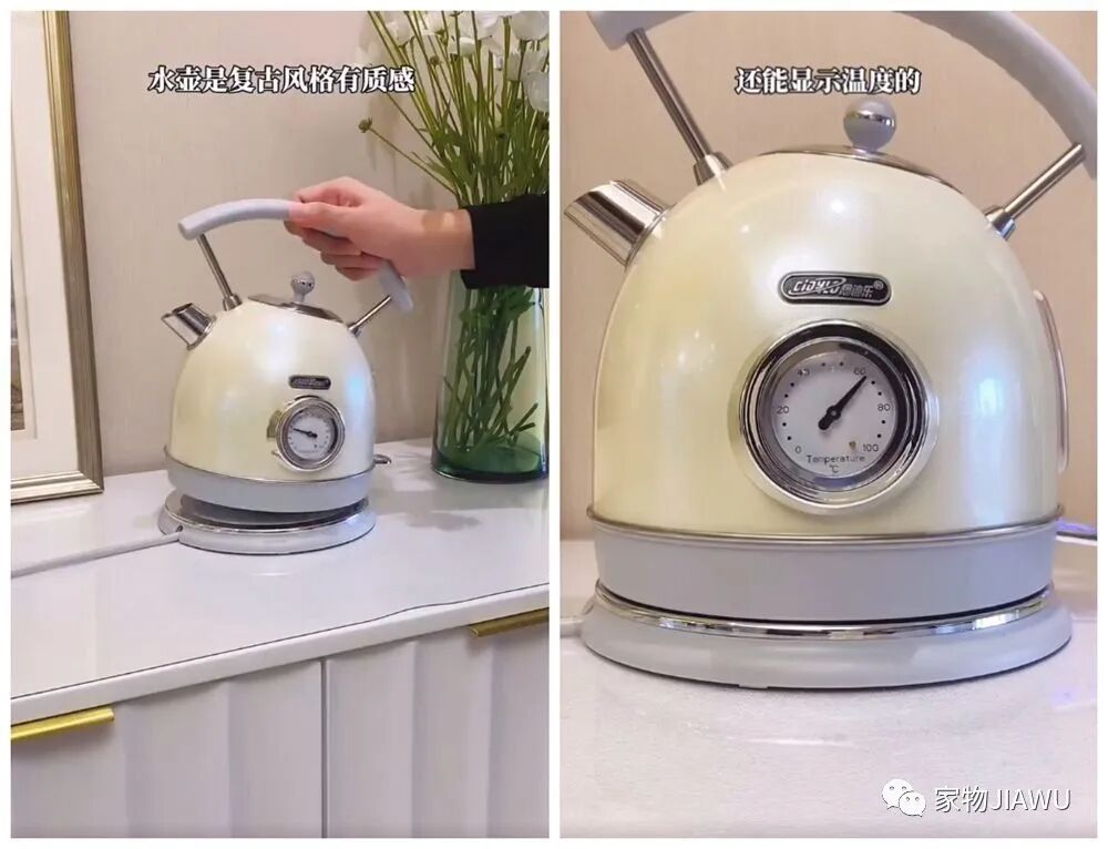 家里的电热水壶太普通,想要个有特点的?强烈建议大家试试这个复古的电热水壶,它本身造型可爱,正面还带有一个指针式的温度计,便于观察壶内温度,烧水用很不错。