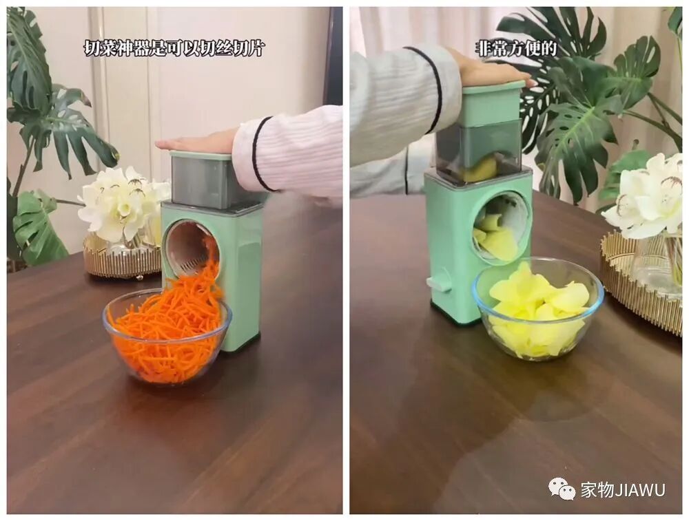 无论是切丝还是切片,这个手摇式的切菜器都能帮你轻松完成,只要把果蔬放进上面的切菜箱里,再旋摇手柄就能轻松完成切菜工作了,对于厨房小白超实用。