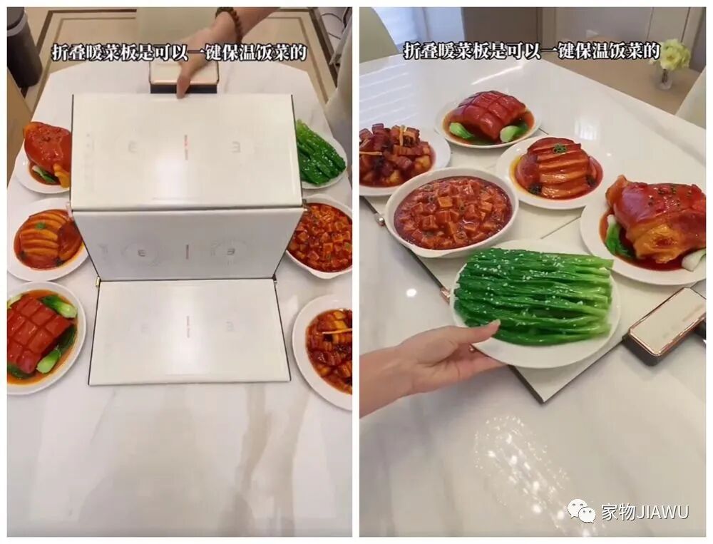 哦对了对了,这个折叠式的菜板也很好用,它平日里折叠起来体积很小,随便塞到柜子里就能收纳,而展开后铺在桌子上,能同时为6盘菜起到保温的效果,避免迟到变冷的饭菜~