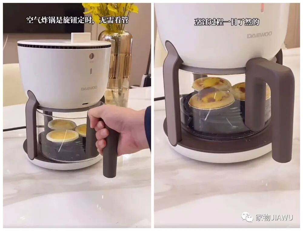 首先是这个圆圆的空气炸锅,它自己就带定时预约的功能,对于上班族来说还是挺方便的;最关键的是,它底部的箱体是透明的,让你能一目了然掌控烹饪过程,实用性很强。