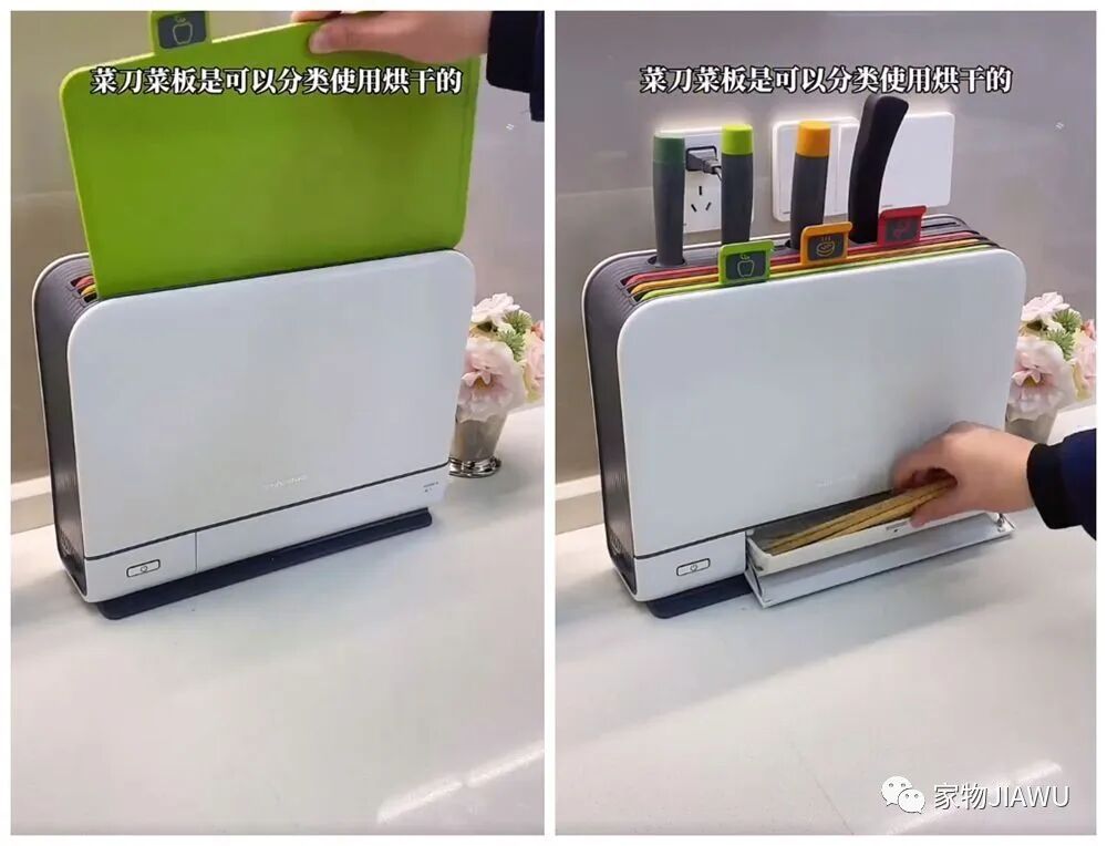 这个烘干架集合了收纳、烘干、分类的功能,既能当作不同用途菜板和刀具的分类收纳架,同时内部还有快速烘干的功能,避免滋生细菌,卫生性拉满。