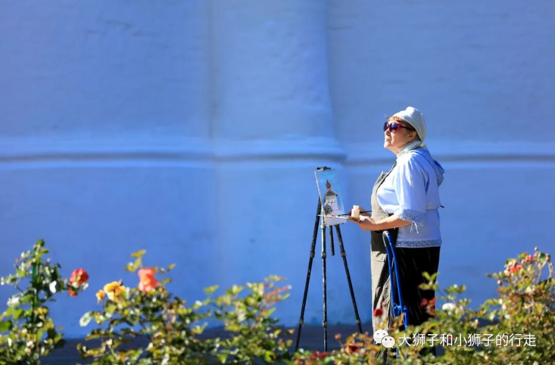 在圣三一大修道院参观时,我注意到教堂的一角有一位极具艺术气质的俄罗斯大妈,在那里支着画板写生创作。