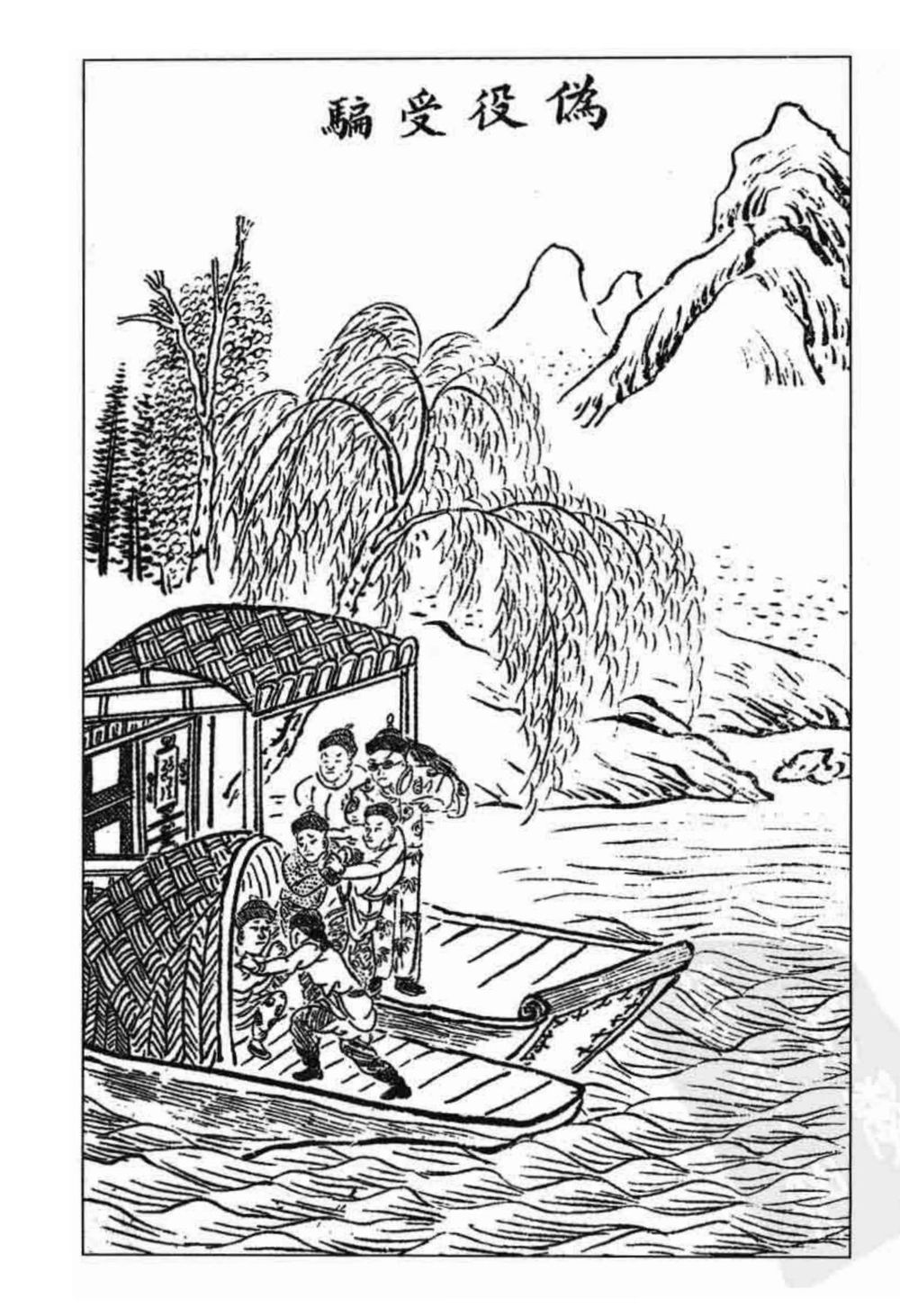客人看见所有的停船无一幸免,人人都咬牙切齿。他便挑选了十几个强壮有力的人,打扮成仆人的样子,又用水晶顶做了个令箭,急忙换成快船尾追那些假的差役。沿江而下,等那些假差役们掳掠满船的时候,客人的快船忽然绕到他们的前面,强行上船,让仆人们把那些假差役擒住,随即用铁索锁住,客人审讯他们说:“本厅奉军门的命令,捉拿假差役的抄抢案,要把你们送省城处罚。”客人查看了赃物,船上银钱累累,假差役们磕头乞求饶命。