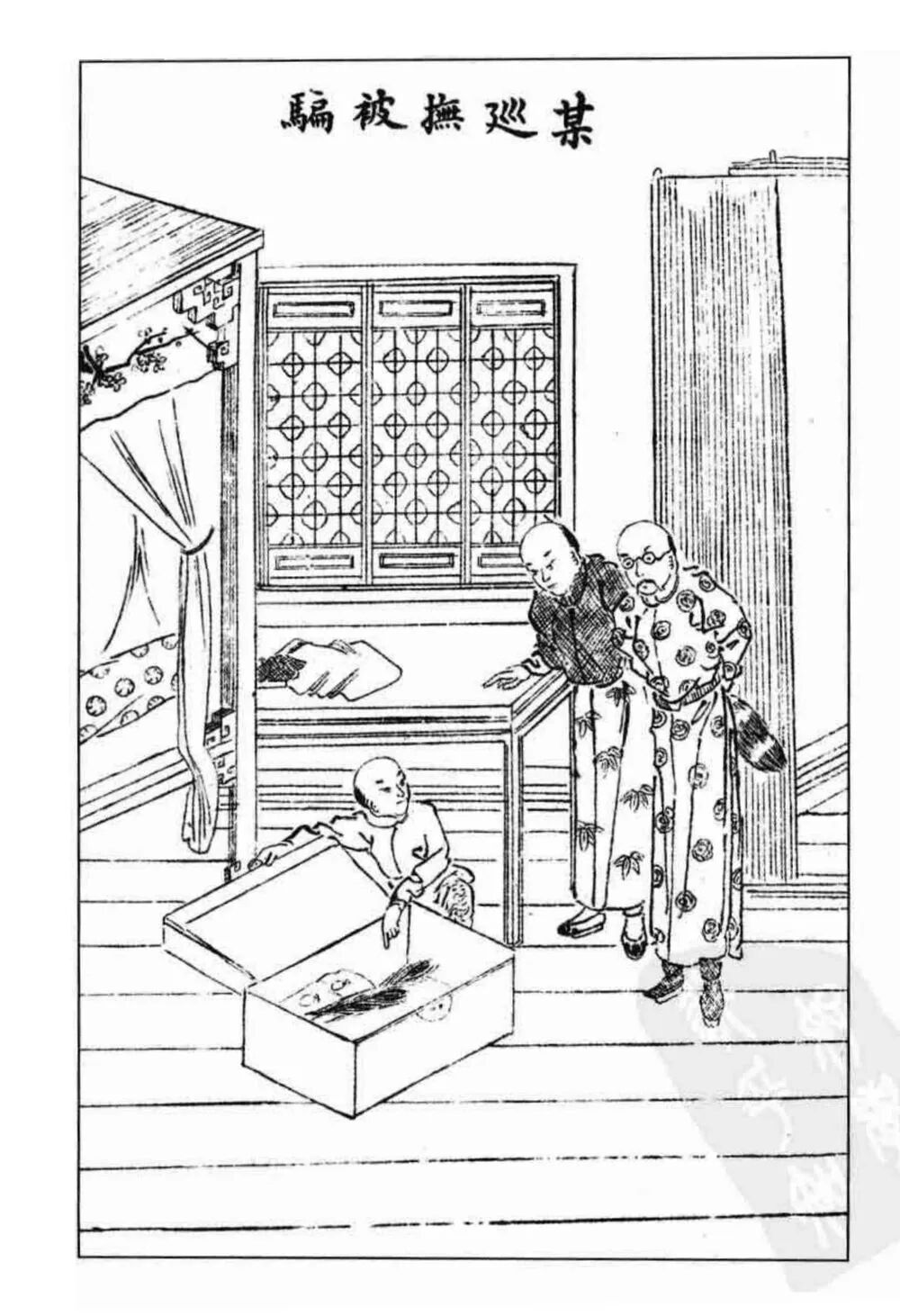 县令乘着两人外出的时候,亲自来检查他们的行李。他们打开箱子,发现里面有秃衿袍、短褂、封带、尖靴等物,另外还有二枚珊瑚和二枝孔雀翎。县令大惊,连忙向巡抚汇报,巡抚也很惊讶。