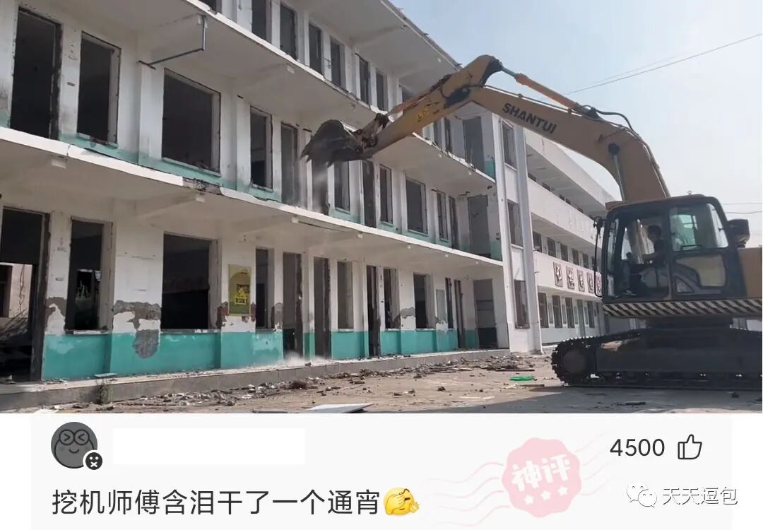 开挖掘机的小哥回来拆母校,为了生活不得不干,他一定痛苦不堪吧!